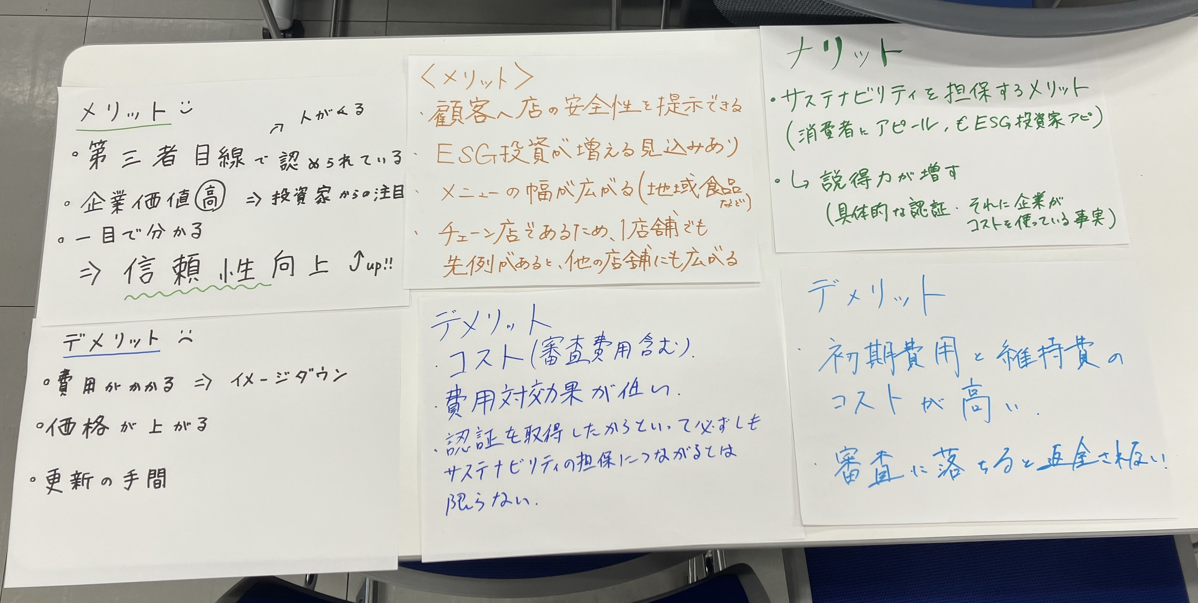 学生のみなさんには、練習として、飲食チェーンの店長の立場から「あるサステナビリティの認証を取得するため、社長にプレゼンをする」という想定で認証取得にかかわる費用のメリットでメリットを考えていただきました。その回答がこちら。